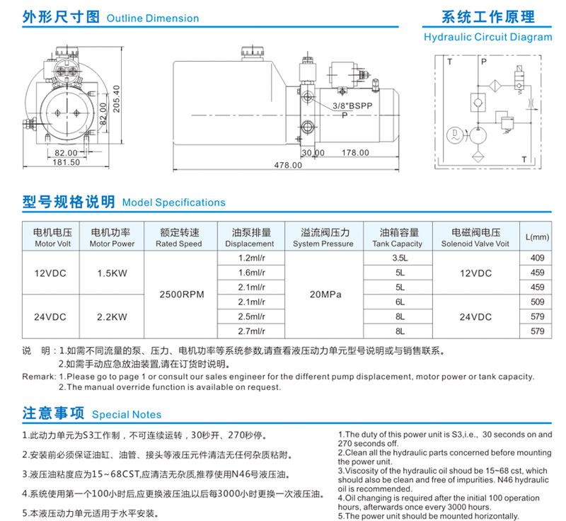 此液壓動(dòng)力單元由高壓齒輪油泵、直流電機(jī)、多用集成塊、 液壓閥、油箱等零部件有機(jī)結(jié)合為一體,系典型的動(dòng)力上升、 重力下降液壓回路。啟動(dòng)電機(jī),實(shí)現(xiàn)上升,打開電磁卸荷閥, 實(shí)現(xiàn)下降,下降速度由內(nèi)置平衡閥自動(dòng)控制。本系列產(chǎn)品是各 種堆高車、小型升降平臺(tái)等物流設(shè)備的理想動(dòng)力源。 Equiped with a high pressure gear pump, a DC motor, a multi-functional manifold, valves and a tank etc. This power unit features power up gravity down function. Start the motor to lift the machine and the lowering movement is activated by the solenoid vavle with the lowering speed controlled by the pressure compensated flow control valve. Products of this series can be widely used in the industry of logistic devices such as fork lift, mini lift table etc.
