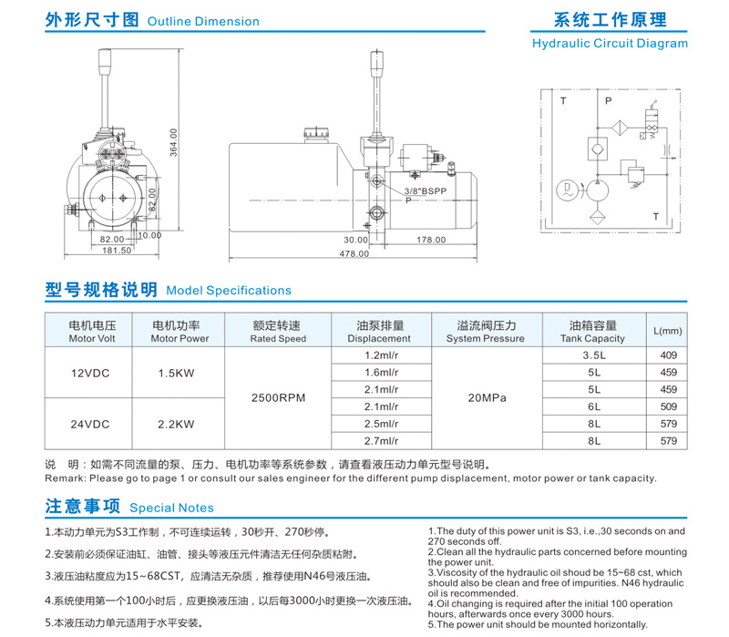 此液壓動(dòng)力單元專為堆高車設(shè)計(jì),由高齒輪油泵、直 流電機(jī)、多用集成塊、液壓閥、油箱等零部件有機(jī)結(jié)合為 一體。手動(dòng)卸荷閥上帶有控制開關(guān),堆高車的升和降由卸 荷閥的手柄控制,下降速度由內(nèi)置平衡閥自動(dòng)控制。 This power unit is designed exclusively for the fork lift,consisting of high pressure gear pump,DC motor,multi-functional manifold, valves, tank, ect . The up and down movement are controlled by the level of the manual release valve, which is equipped with an electric switch for the motor start. The lowing speed is automatically adjusted by the pressure compensated flow control valve.