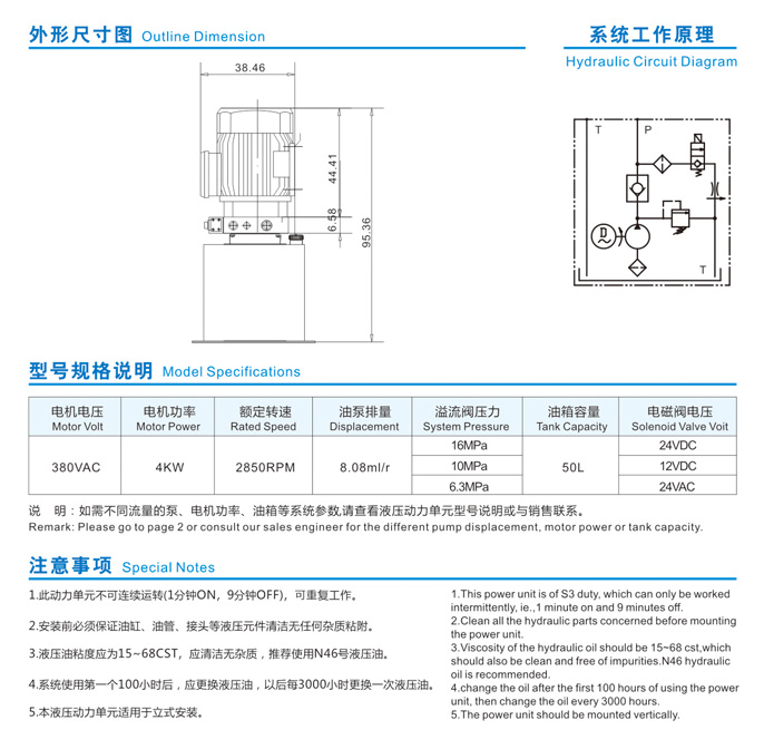 此液壓動力單元專為大型升降平臺設計,由高齒輪油泵、 交流電機、多用集成塊、液壓閥、油箱等零部件有機結合為 一體。升降平臺的下降由電磁卸荷閥控制,下降速度由內(nèi)置 性平衡閥控制。當升降平臺升到高處而系統(tǒng)電源出現(xiàn)故障時, 通過手動放油功能使升降平臺下降。 This power unit is designed exclusively for large sized lift table, Consisting of high pressure gear pump, AC motor, multi-functional manifold, valves, tank, ect. The lowering movement is activated by the solenoid valve with the speed controlled by the adjustable throttle valve. When the lift rises to a high position, but the power supply is cut, the lowering movement is controlled by the manual override function.